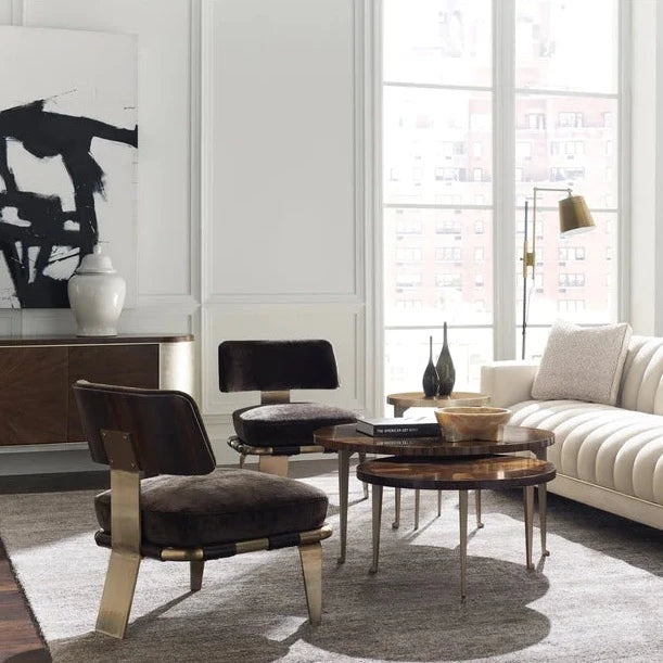 Here is our 21st century interpretation of a klismos design that mixes metal, wood and leather into a highly versatile side chair. A seamless Golden Bronze metal tubular design creates the frame for the seat of the chair. Two thin, wide solid metal legs, along with a rear metal plate, form a truly sculptural base. Classic dark leather strapping around the seat deck provides the base upon which a plush dark espresso chenille cushion sits. Suspended from its metal frame is the winged outer back of the chair in fumed figured eucalyptus wood, finished to a high sheen in Aged Bourbon. A matching back cushion in the same espresso chenille completes this look that is at once retro and remade.