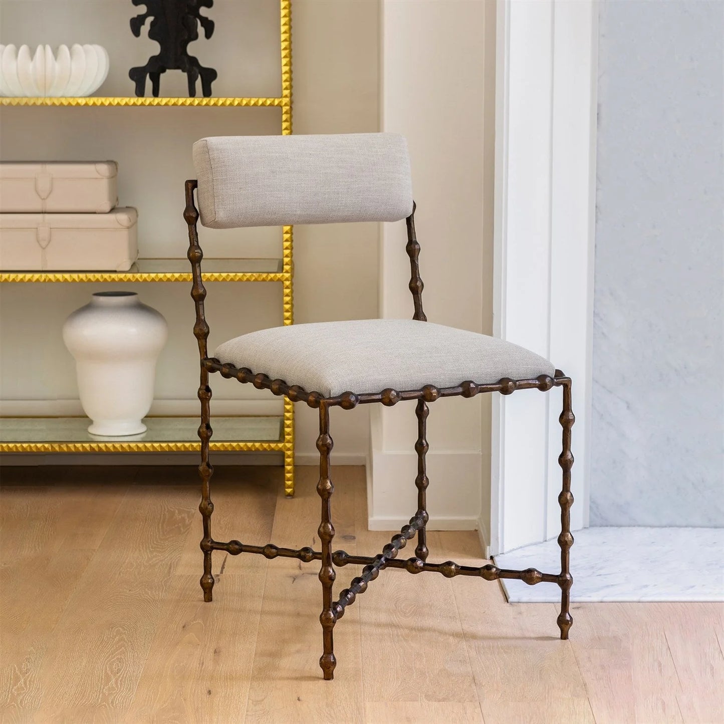 Unexpected and modern chair and bench frames inspired by organic tree knots, accented by textural fabrics. Each piece is made from hand-forged iron and reflects the natural beauty and permanence of the material.